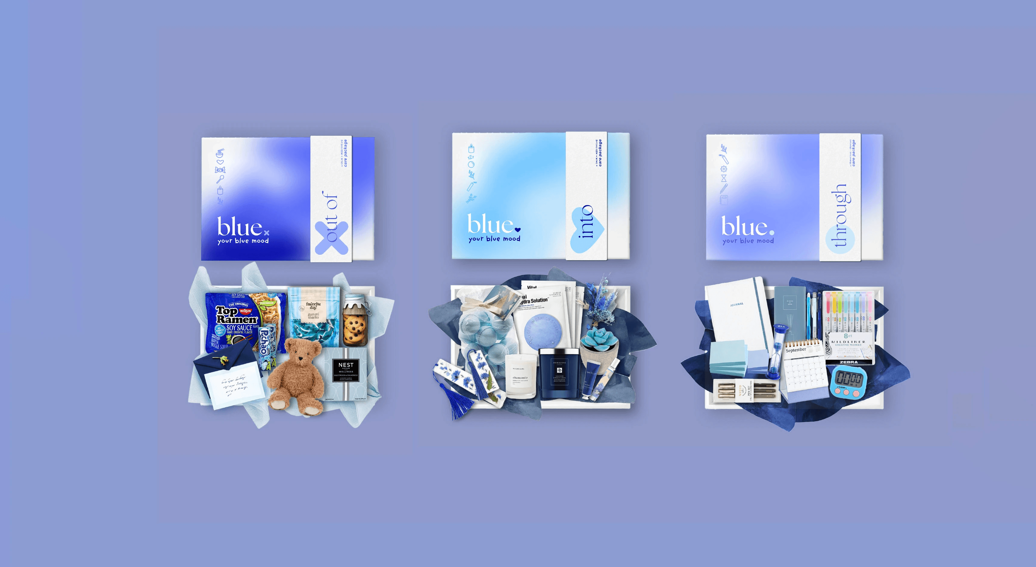 inspired by different connotations of the color blue, "blue: your blue mood" is a product concept for a care package meant to bring a user into, out of and through three different manifestations of a "blue" mood.
